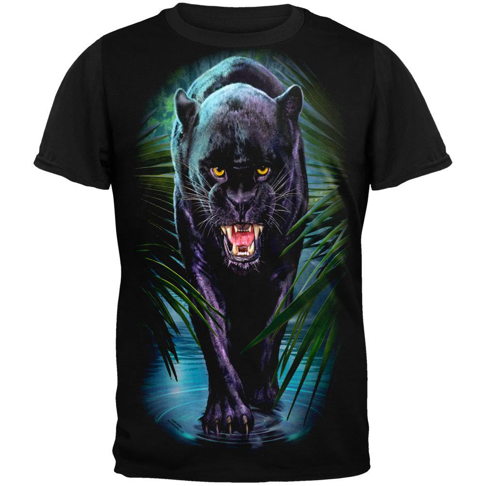 Jeff Wack. This exclusive design of a black panther prowls out of the jungle on this all over polyester, crew neck, classic fitted, short sleeve t-shirt. The dye sublimation printing process creates slight imperfections that are unique to each garment.