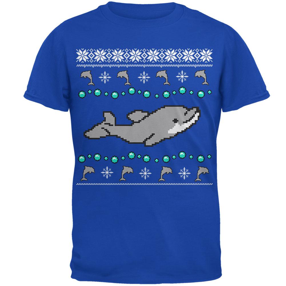 Be the best dressed this holiday season with this awesome ugly Christmas sweater design, featuring dolphins swimming around with bubbles and snowflakes. Printed on a 100% cotton men's t-shirt.