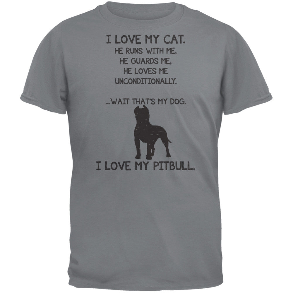 Lucia Guarnotta. Boast your love for your Pitbull with this t-shirt featuring the text, "I love my cat. He runs with me. He guards me. He loves me unconditionally. ...Wait, that's my dog. I love my Pitbull." This exclusive Animal World design is printed on a 100% cotton adult t-shirt.