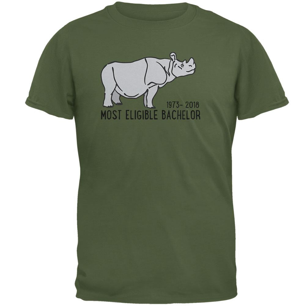 Celebrate Sudans life with this memorial tee. This Animal World design is printed on a 100% cotton men's t-shirt, featuring a cartoon rhino with the text "1973-2018 Most Eligible Bachelor".