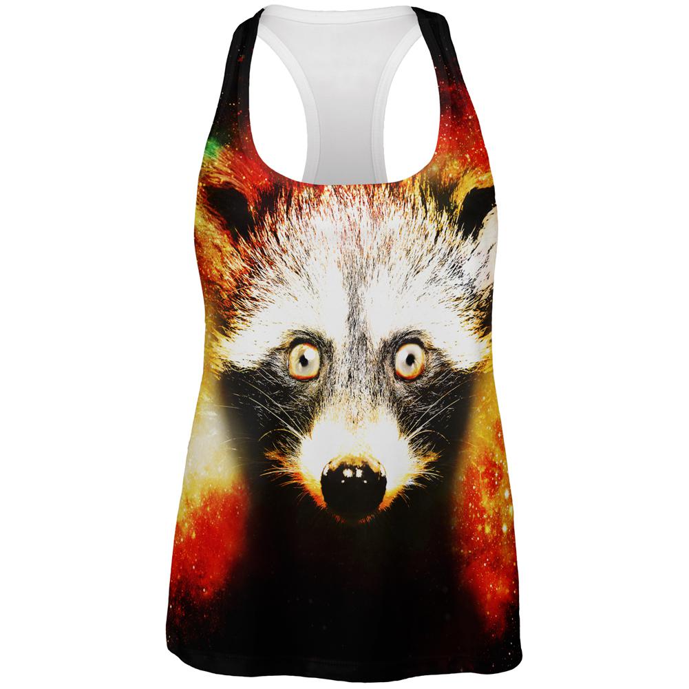 Check out this awesome Old Glory galaxy trash panda design featuring a picture of a curious raccoon with a space background. Printed on a 100% polyester women's workout tank top. The dye sublimation process creates slight imperfections that are unique to each garment.