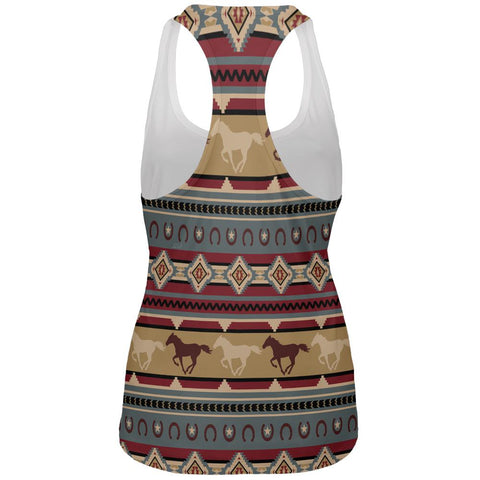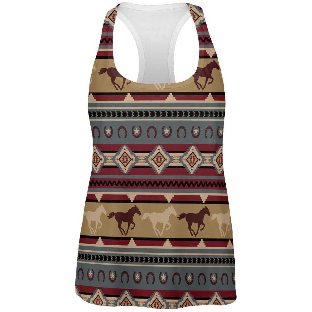 Jon Q Wright brings you this awesome tank with running wild horses and horseshoes all over in a southwestern pattern. This Animal World design is printed on a polyester women's tank top. The dye sublimation printing process causes slight differences that are unique to each individual garment.